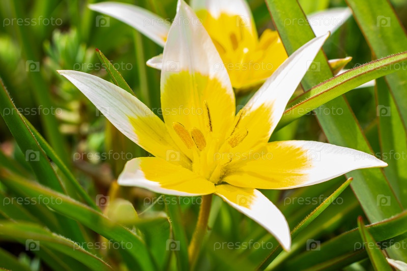 Желтый и белый тюльпан Тарда цветет в саду на естественном фоне