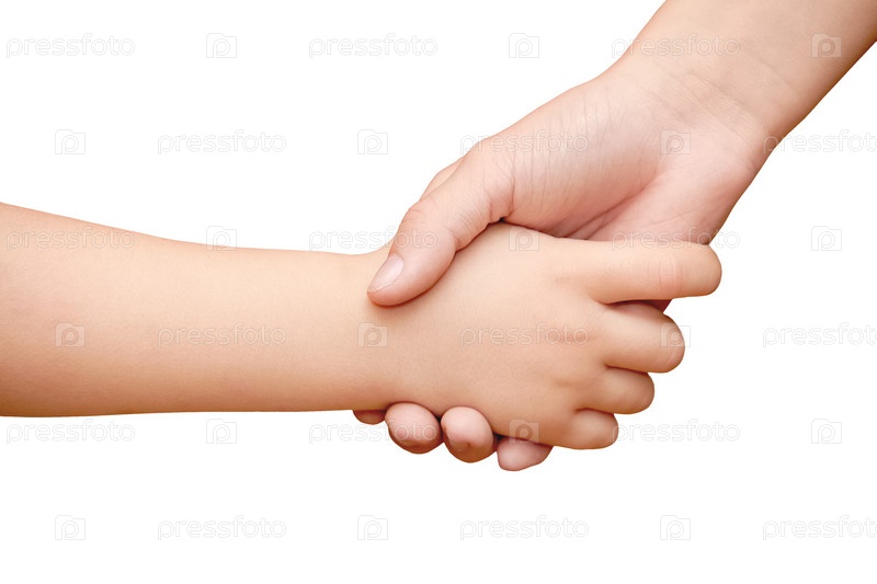 Рука ребенка пожимает руку подростку на белом фоне. Рукопожатие договор и доверие