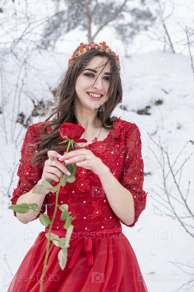 Девушка в длинном красном платье на фоне снега
