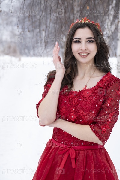 Девушка в длинном красном платье на фоне снега