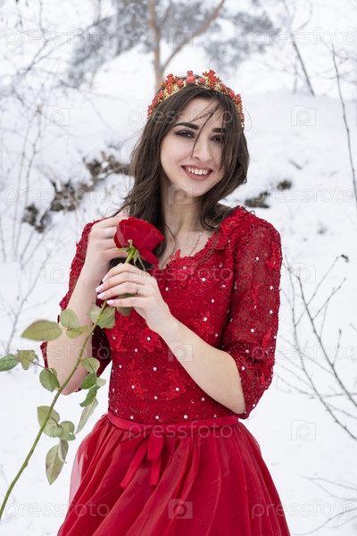 Девушка в длинном красном платье на фоне снега