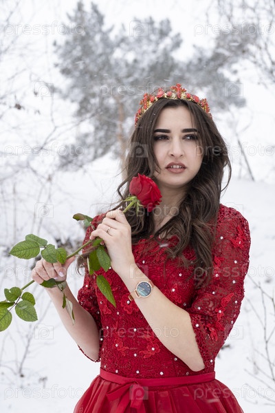 Девушка в длинном красном платье на фоне снега