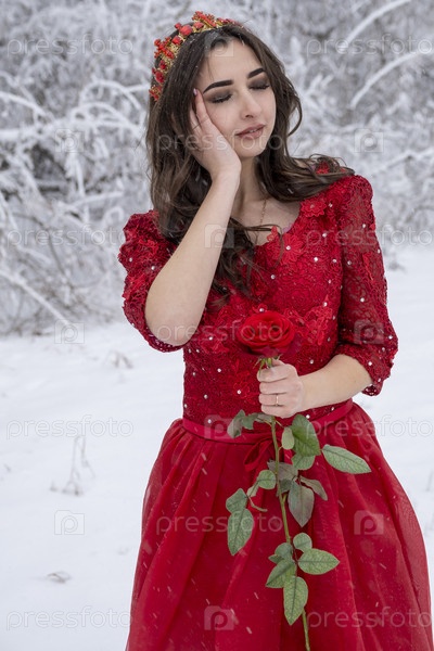 Девушка в длинном красном платье на фоне снега