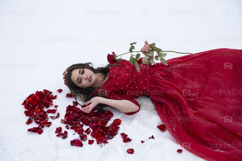 Девушка в длинном красном платье на фоне снега
