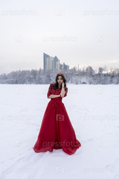 Девушка в длинном красном платье на фоне снега