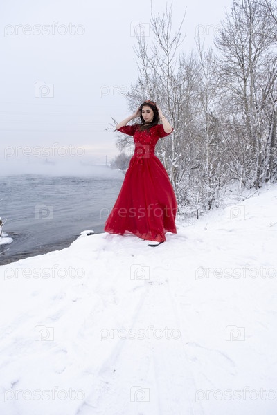 Девушка в длинном красном платье на фоне снега