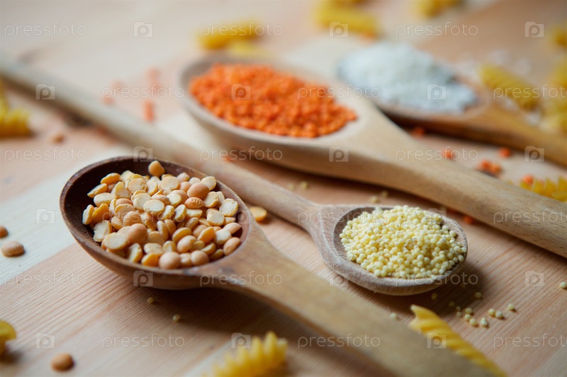 На поверхности дерева находятся деревянные ложки разных видов, которые наполнены крупами разных сортов