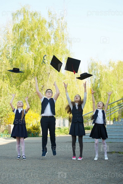 Три девочки и мальчик — выпускники начальной школы в шапке выпускника и школьной форме