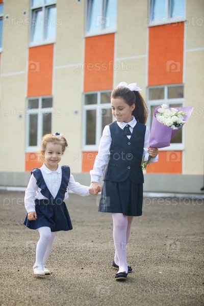 Первоклассница в держит свою милую младшую сестру
