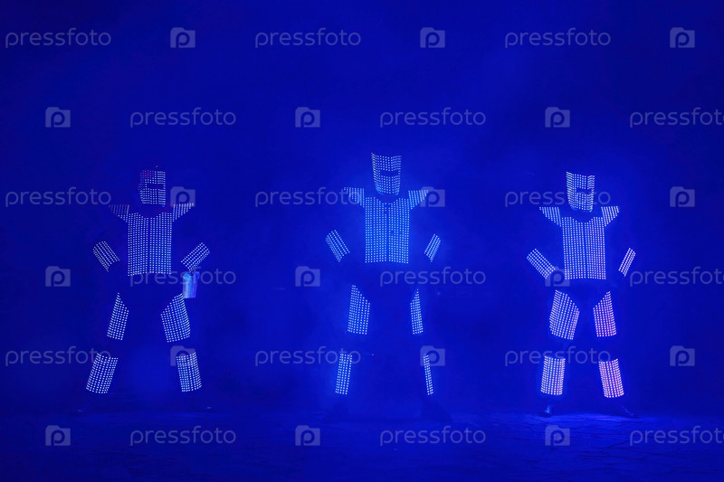 Три артиста устраивают лазерное шоу в светящихся костюмах. Развлечения для детей и взрослых. Аниматоры с танцевальной программой