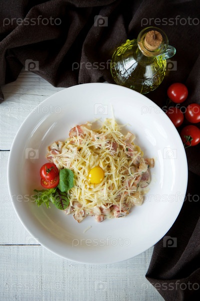 Паста с беконом, белым соусом и свежим перепелиным яйцом. Подается на белой тарелке с красными помидорами