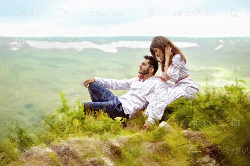Красивая молодая пара мужчина и женщина находятся на природе
