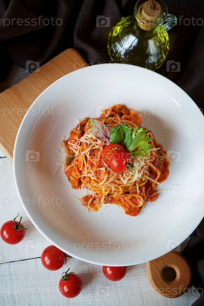 Паста с красным соусом, помидорами и базиликом. Подается на белой тарелке