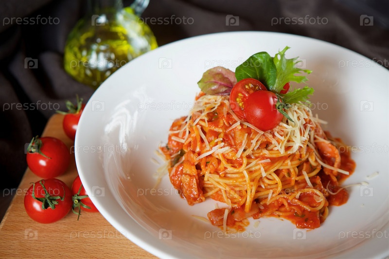 Паста с красным соусом, помидорами и базиликом. Подается на белой тарелке