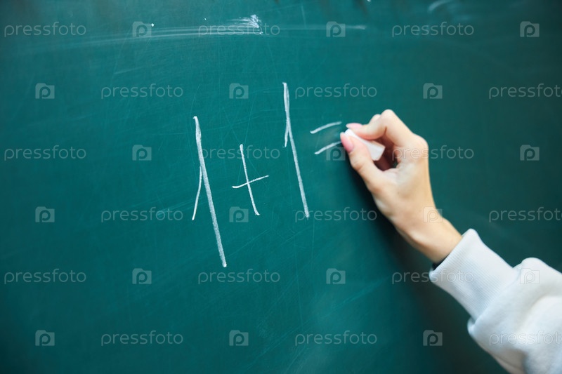 Рука подростка мелом пишет простой математический пример на зеленой доске. Концепция образования и обучения
