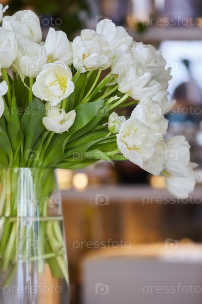 Букет свежих белых тюльпанов стоит на столе в стеклянной вазе. Украшение стола к празднику