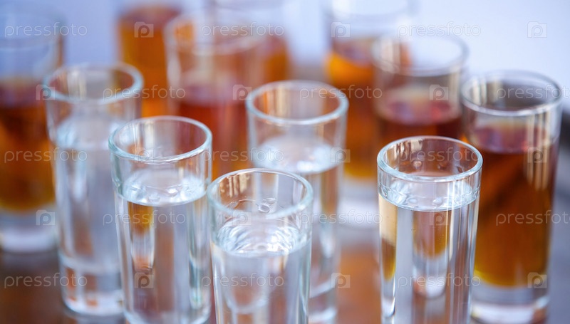 Стеклянные стаканы с водкой и коньяком алкогольных напитков. Бар или кафе