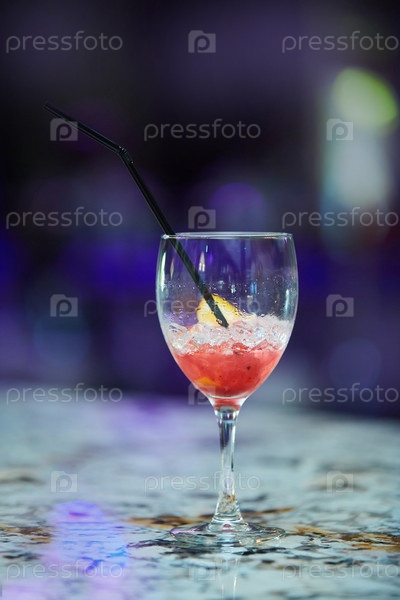 Красный алкогольный напиток со льдом в стакане на барной стойке