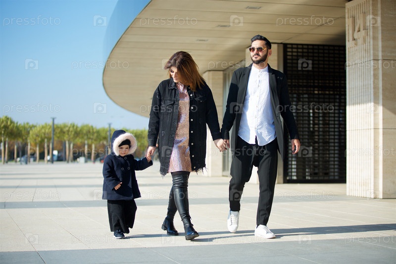 Родители мама и папа гуляют с маленькой дочерью