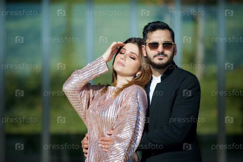 Молодая красивая пара стоит в парке на фоне современного здания