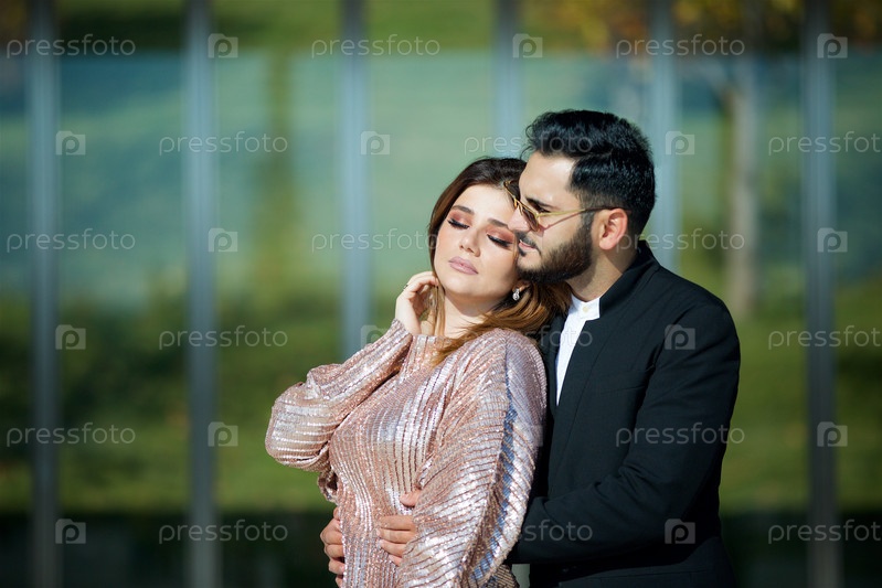 Молодая красивая пара стоит в парке на фоне современного здания
