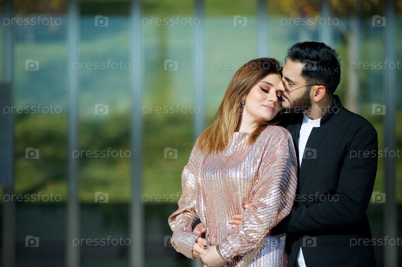 Молодая красивая пара стоит в парке на фоне современного здания