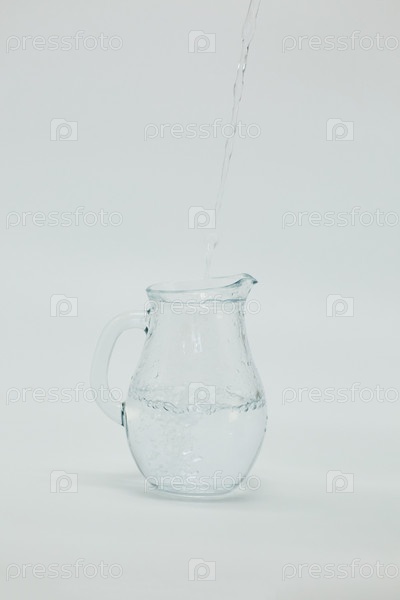 Чистая экологически чистая вода наливается в стеклянный кувшин. Белый фон