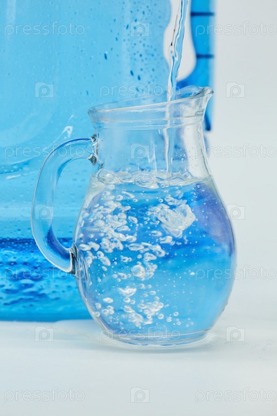 Чистая экологически чистая вода наливается в стеклянный кувшин. На заднем плане синяя пластиковая бутылка с водой. Белый фон