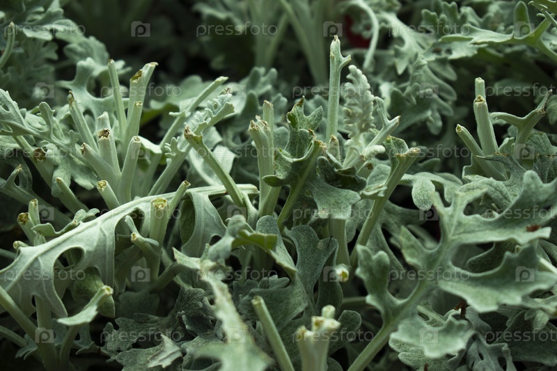Городские зеленые цветы или трава, высаженная на лужайках, в парках и садах, с оттенками белого и прохладного голубого. Крупный план. Природа и жизнь. Парки и растения. Якобея приморская