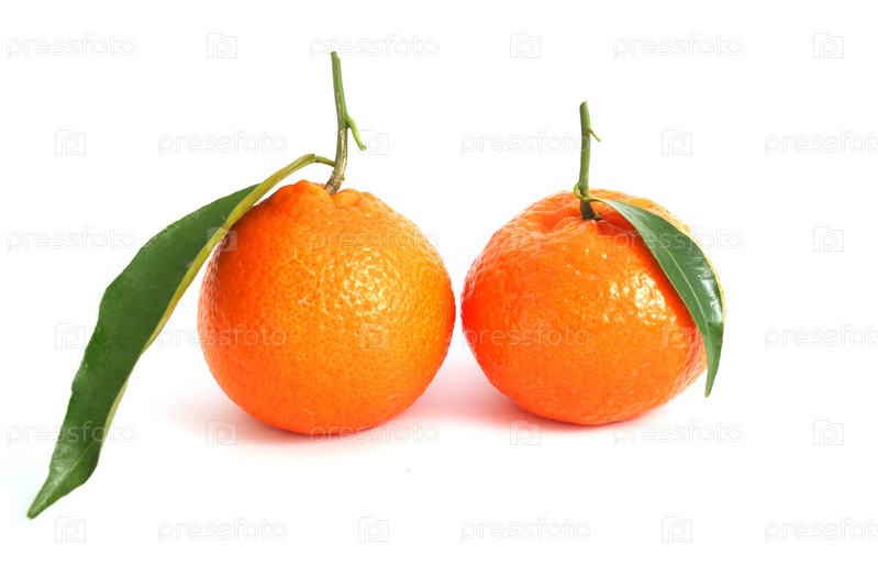 Два мандарина с зелеными листьями на белом фоне