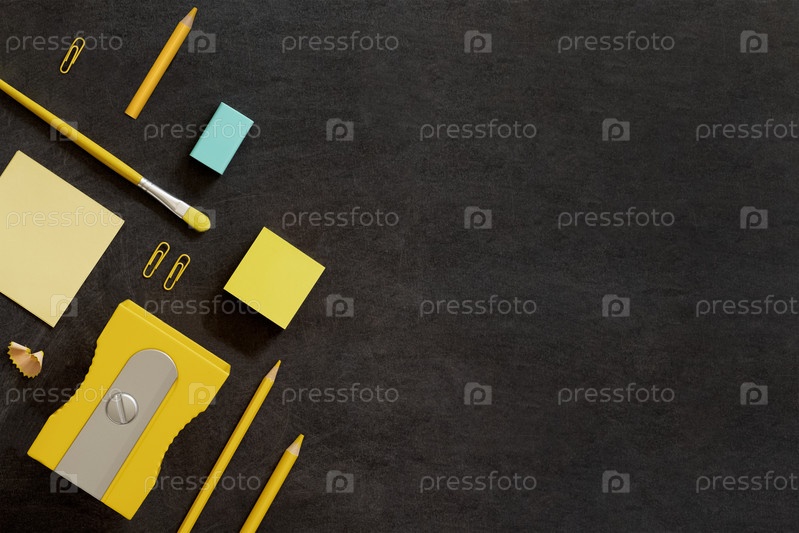 Флэтли, свободное место, место для копирования. Желто-синие канцтовары на черном фоне