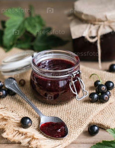 Домашнее варенье из черной смородины и свежие ягоды на деревянном фоне. Домашняя концепция сохранения. Летние сезонные ягодные джемы