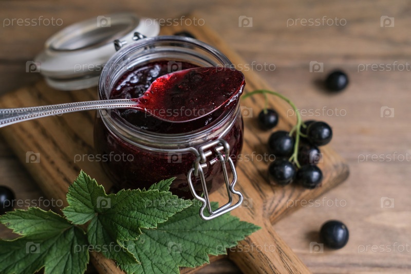 Домашнее варенье из черной смородины и свежие ягоды на деревянном фоне. Домашняя концепция сохранения. Летние сезонные ягодные джемы