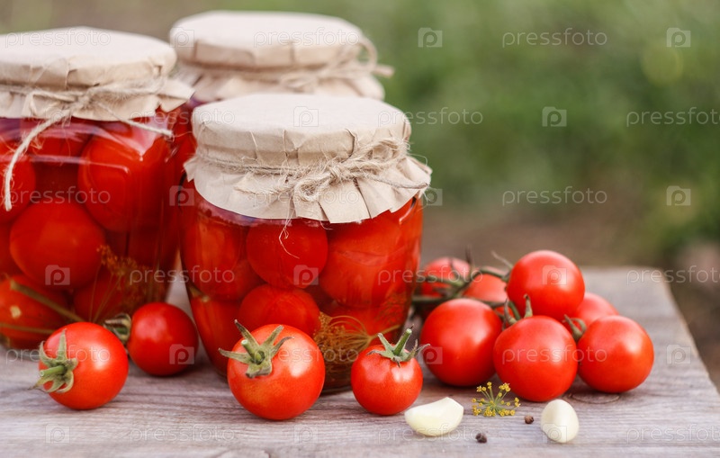 Домашние маринованные помидоры черри в банке на деревянном столе