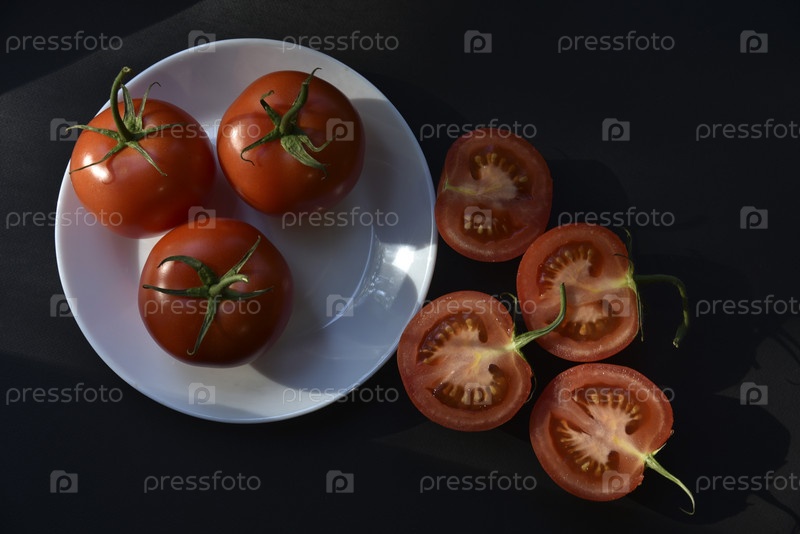 Спелые красивые помидоры на белой тарелке сверху. Вкусные помидоры натюрморт