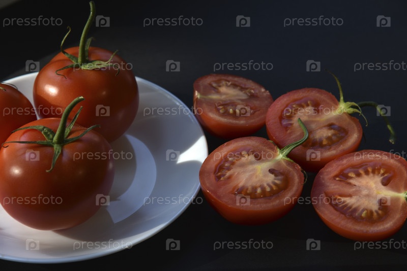Спелые красивые помидоры на белой тарелке сверху. Вкусные помидоры натюрморт