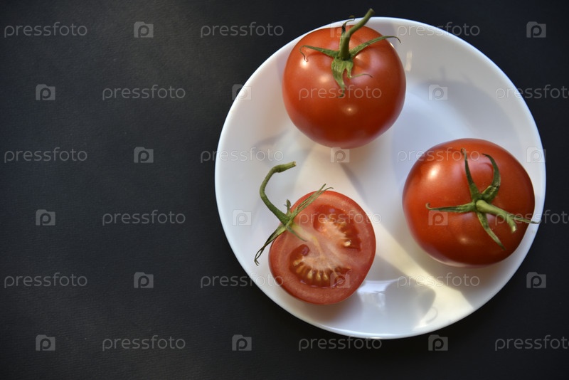 Спелые красивые помидоры на белой тарелке сверху. Вкусные помидоры натюрморт