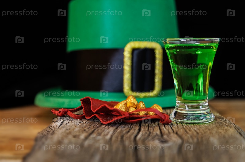 Зеленый напиток в день Патрика, шляпа лепрекона и золотые гранулы
