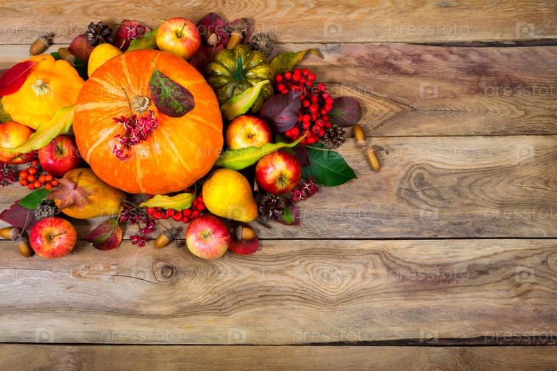 Композиция на День благодарения с тыквой, яблоками, грушами, ягодами рябины, пространство для копирования