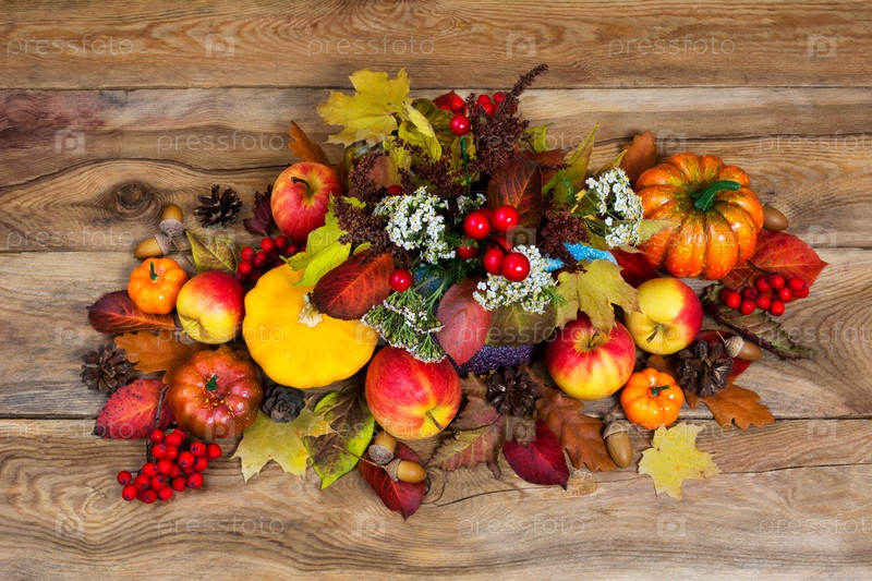 Композиция на День благодарения с белыми цветами и яркими осенними листьями