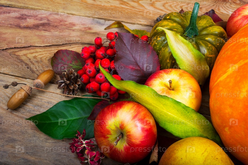 Урожай фон с яблоками, ягодами рябины, зеленым сквошем