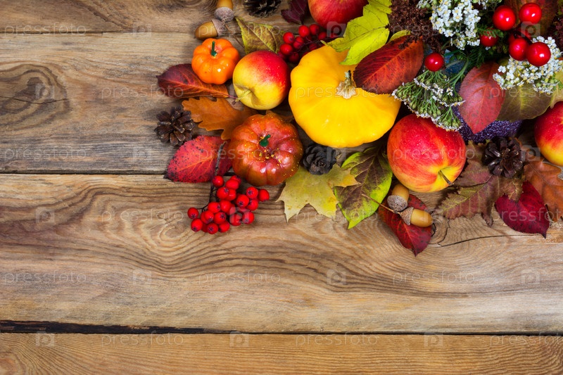 Фон благодарения с желтым сквошем, тыквой, яблоками, копией пространства