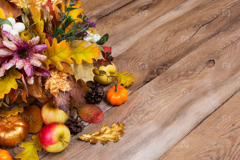 Деревенский осенний фон с золотой тыквой и дубовыми листьями