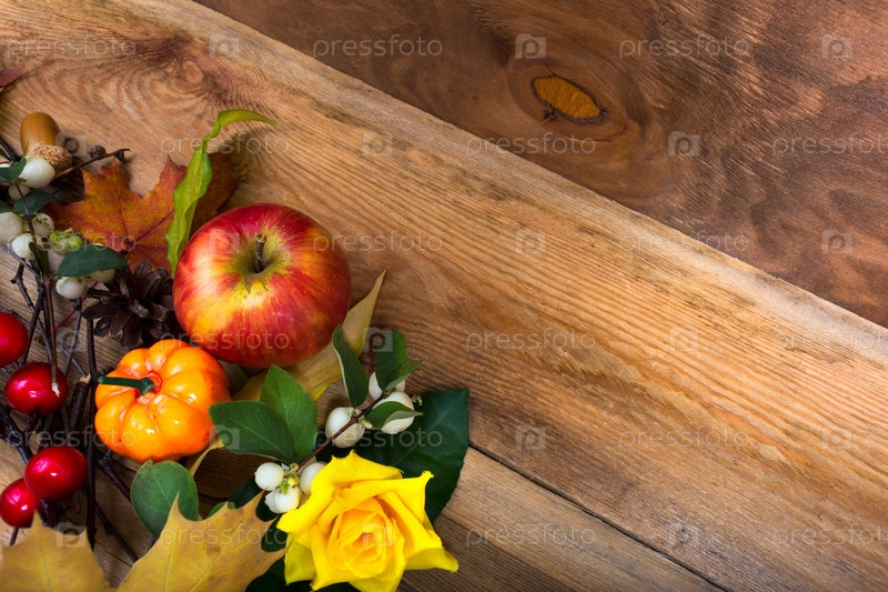 Деревенский осенний фон с яблоком, тыквой, желтой розой, копией пространства