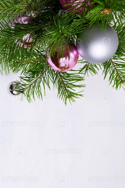 Рождественская композиция с розовыми и серебряными безделушками, пространство для копирования