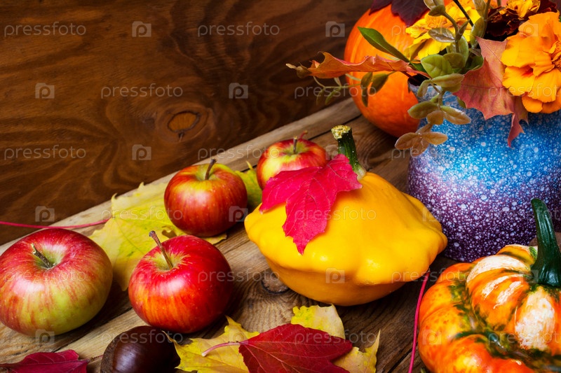 Спелые яблоки и желтая тыква на фоне Дня Благодарения