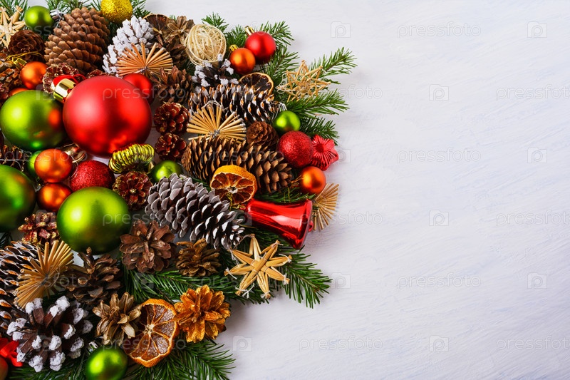 Рождественская композиция с красными, зелеными орнаментами, соломенными звездами, копией пространства