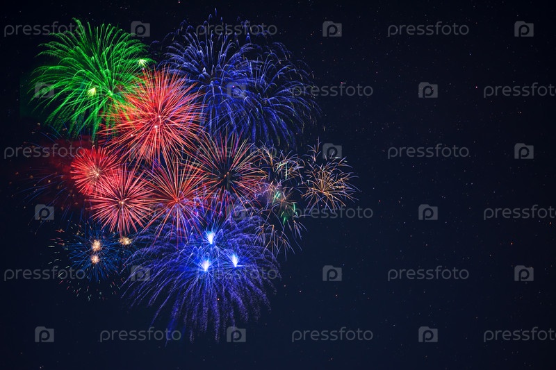 Красивый сине-зеленый красный праздничный фейерверк копией пространства