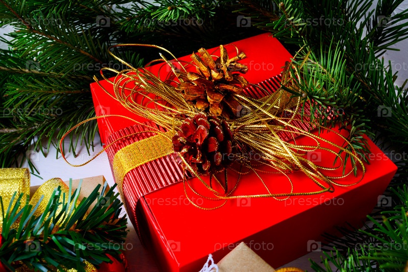 Рождественская подарочная коробка с золотыми сосновыми шишками и еловой веткой