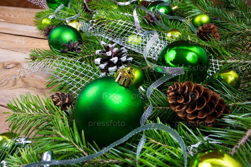 Рождественское украшение с зелеными шарами, еловыми шишками и серебряной лентой